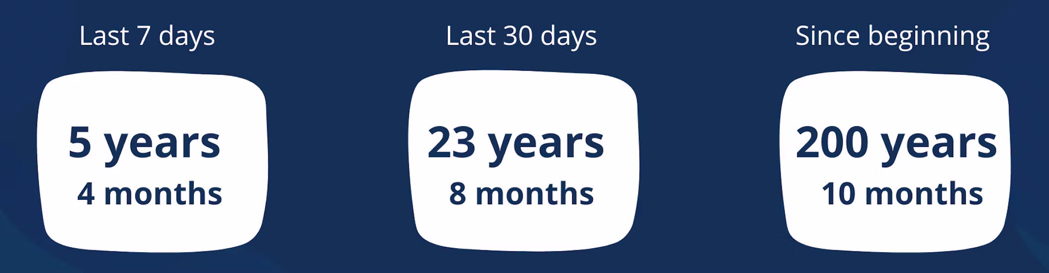 - Last 30 days: 23 years 8 months 25 days 8 hours 57 minutes 19 seconds